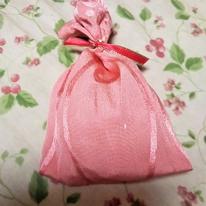 匂い袋のリボン、よく見るとアルガンクリームの箱にかけてあったリボンです。
